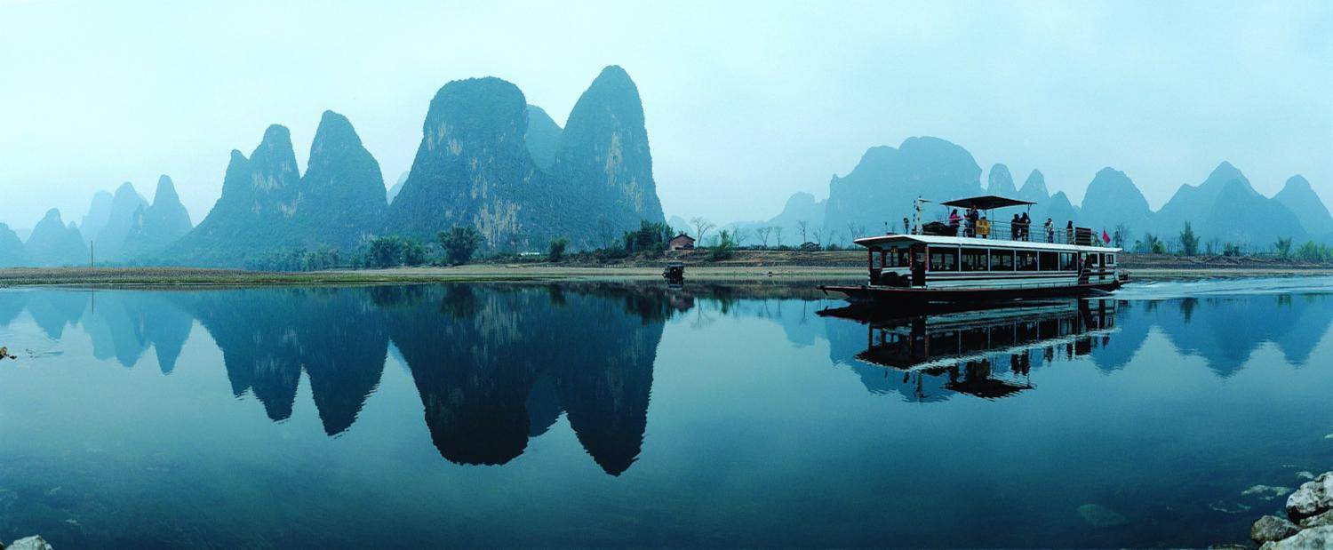 漓江自桂林至阳朔83公里水程,她酷似一条青罗带,蜿蜒于万点奇峰之间,沿江风光旖旎,碧水萦回,奇峰倒影、深潭、喷泉、飞瀑参差,构成一幅绚丽多彩的画卷,人称“百里漓江、百里画廊”是广西东北部喀斯特地形发育最典型的地段。